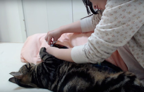 「なかなか」どころか「全力で」させてくれないケースも間々ありますが、熟睡中であれば、自分が爪を切られていると気付かぬあいだにコトを済ませてしまえるため、猫と人と、お互いのパワーゲージ消費が少なくすむ方法と言えましょうか。そんな模範動画です。