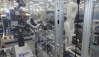 2018年から新しく加わったというメティスは、ロット生産用などで使われている機種専用ロボットと協働している。メティスと専用ロボットは、何枚かのメイン基板が並んだラインを挟んで左右に配置されている。2台が同時に作業することもあれば、専用ロボットの動作とぶつかりそうなときは、メティスが自ら作業を止めて、専用ロボットの動作が終わるまで待つ。工場では実際にその様子が確認できた。