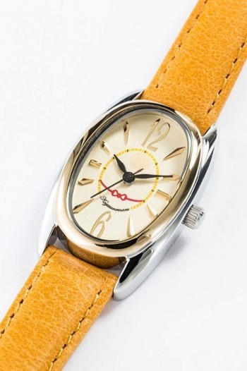 シルバーのフレームを採用。着物についている装飾をイメージしたチェーン型ベルトが特徴で、楕円形の文字盤には銀色に輝く「鶴」の文様が描かれています。