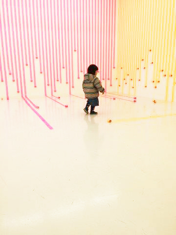 大人が驚いたのはこの入り口。ビジュアルをすべてマスキングテープで表現しているのです。イメージは方眼紙とのこと。あ、そうですね、ここはもともと学校でしたものね。なんだか引き込まれる感覚で入り口を通過しました。