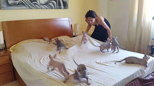 注目すべきは、お姉さんの慣れた手つき。シーツの下に入ってくる子猫を上手に取り出して、手際よくパッパッパッパとシーツを伸ばしています。
