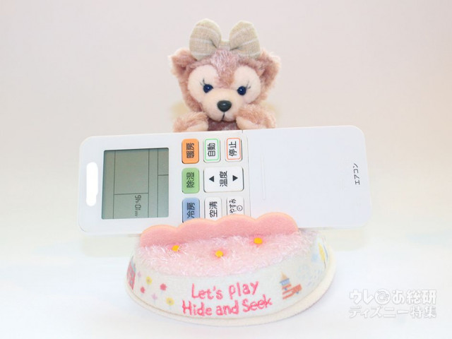 ダッフィーにはスマートフォン、シェリーメイにはエアコンのリモコンを持ってもらっています。