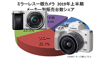 全国の主要家電量販店・ネットショップのPOSデータを集計した「BCNランキング」のミラーレス一眼カメラ部門で、2019年上半期(1月~6月)の販売台数シェアでNo.1に輝いたのは、キヤノンだった。同社は、18年の年間販売台数シェアで首位を獲得しており、このまま推移すれば2年連続No.1が実現する可能性がある。