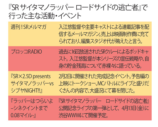 「『SR サイタマノラッパー』シリーズには、地方の若者の挫折を鮮やかに描いた青春映画としての魅力と共に、新しい仕掛けの魅力も盛り込まれています。1作目からSNSを有効に活用し、口コミで全国に人気が拡がりました。最新作でもSNSを使ってエキストラ2000人を集めたり、USTREAM放送で映画の小道具を募るなど、新しい制作方法を採ると同時に、新しい宣伝の仕方も実現しています。本作の入江悠監督は、インディペンデント映画として日本映画をひっくり返す作品を作る、ということを自覚して制作しています」(門間さん)