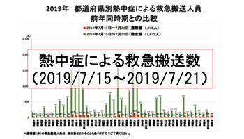 総務省消防庁が発表している熱中症情報によると、7月15日~7月21日の1週間に全国で熱中症で救急搬送された人数は速報値で1948人。前週の797人から大幅に増加し、2.4倍の数値を記録した。ただ、昨年の同期間では11倍の2万2575人(確定値)が救急搬送されており、例年を下回り続けている。