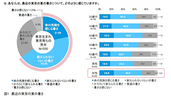 「あなたは、最近の東京の夏の暑さについて、どのように感じていますか」との質問に、43.6%が「耐えられないくらいの暑さ」、21.6%が「命の危険を感じる暑さ」と回答。合計で6割以上の人が、最近の東京の夏は“普通の暑さではない”と感じていた。
