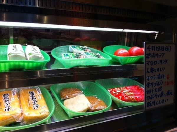 店に入るなりガラスケースにうまそうな刺身やお惣菜が小皿に並んでいる。