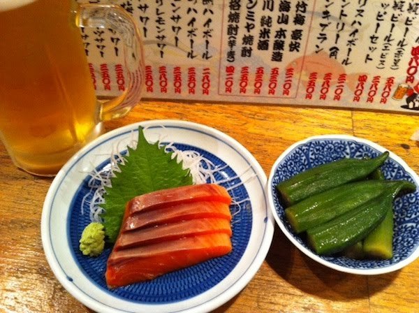ちなみにガラスケースからチョイスした応援セットの刺身は鮭、総菜はオクラ。