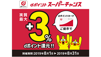 NTTドコモは、エントリーした上で街のdポイント加盟店で「dポイントカード」を提示すると、通常付与するdポイントに加え、買い物金額の最大3%をdポイント(期間・用途限定)で還元するキャンペーン「dポイント スーパーチャンス」を8月1日~31日に開催する。
