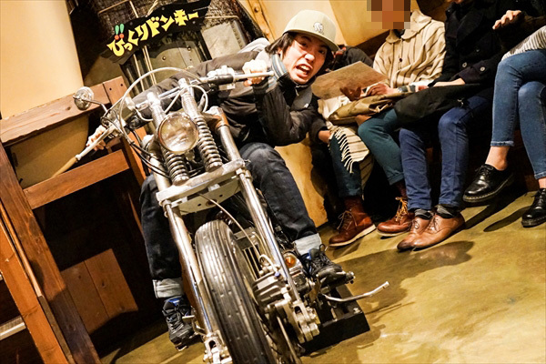 また、「びっくりドンキー」のロゴが飾られたハーレーもありました。店員さんに聞くと、乗って写真を撮ってもいいそうです。こうして斜めにすると、より臨場感が出ますね…。