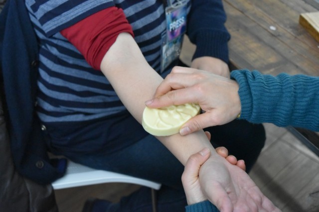 見学が終わった後は、一緒に参加した人と好きな香りのマッサージバーを選びハンドマッサージ。