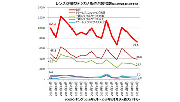 売り上げも伸びていない。2018年1月の販売台数を100とした指数で、レンズ交換型カメラ全体の動きを見ると、この6月が75.7。うち一番シュリンクしているのがフルサイズ未満の一眼レフだが、フルサイズ以上の一眼レフも5.1から2.0に縮小している。