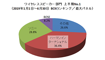 全国の主要家電量販店・ネットショップのPOSデータを集計した「BCNランキング」のワイヤレススピーカー部門で、2019年1月1日~6月30日の販売台数シェアでNo.1を獲得したのは、ハーマンインターナショナルだった。昨年、年間販売台数シェアNo.1を獲得した勢いをそのままに、市場で存在感を発揮した。