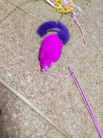 「いつもスリゴロで寂しがりなえんしゅーですが、野生の血は残っているようで、天然毛のアイテムだけには反応します! 1番のお気に入りはスーパーで240円ほどで購入したネズミちゃん。他の材質だとネズミ型でも反応しないのが不思議でなりません」