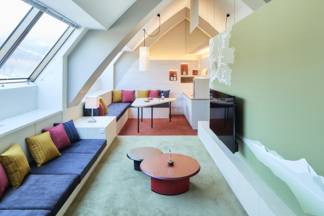 ツインからトリプル、スイートまで、スタイルに合わせてお部屋が選べる磐梯山温泉ホテルですが、今回宿泊したのは「会津モダンスイート」。1階にリビング、2階が寝室になっているメゾネットルームで、こだわりのしつらえは要チェック!