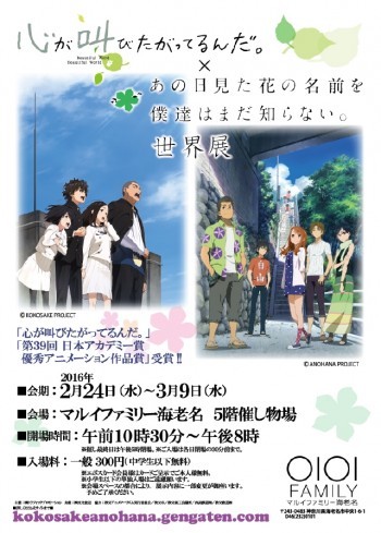 神奈川県にある「マルイファミリー海老名」で、2016年2月24日から『心が叫びたがってるんだ。× あの日見た花の名前を僕達はまだ知らない。ミニ世界展』が開催されます。