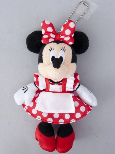 大きめのドット柄のワンピースにエプロンのミニーマウスぬいぐるみバッジも一緒に!