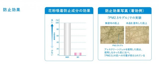 イハダ アレルスクリーン の公式サイトによると、イハダ アレルスクリーンに配合されている花粉吸着防止成分は効果が数値で実証されており、また、アレルスクリーンを使用した肌は、使用しなかった肌に比べ「PM2.5」の肌への付着が抑えられていることがわかりました。