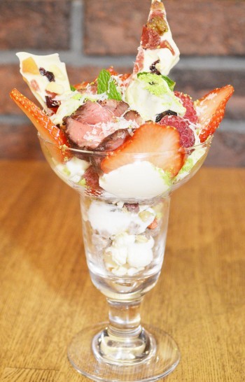 とは言えホワイトチョコをたっぷり使用したこのパフェの味は未知数。どんなマリアージュが仕掛けられているのか、これは肉好きとしては一度食べてみたい!