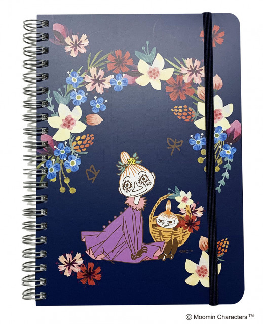 「ハイナインノート手帳 リース ネイビー」は、シックなネイビーはどんな文具にも合う深い色合いが特徴です。スナフキンとムーミンとお花が美しい。