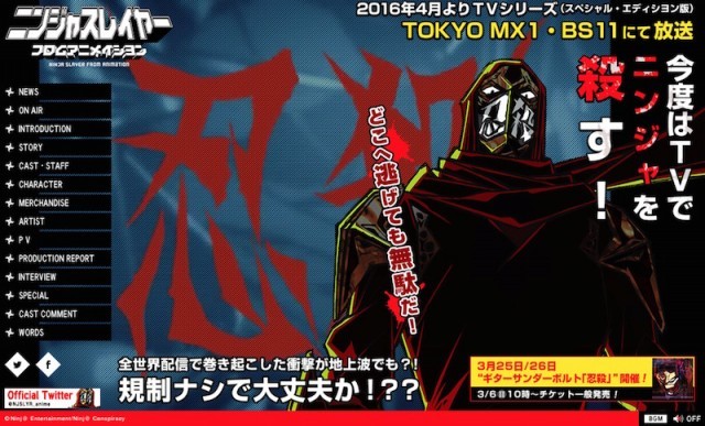 2015年にネット動画サイトで公開され、多くの重篤ニンジャジャンキーを生み出したアニメ「ニンジャスレイヤー フロムアニメイシヨン」が、2016年4月よりTVアニメとして放送されることが決定しました。公式サイトもリニューアルされ、新たなキービジュアルが披露されています。