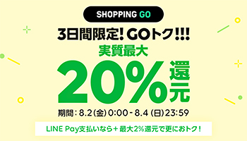 LINEは8月2~4日の3日間限定で、実質最大20%還元キャンペーン「GOトク!!!」を実施する。期間中にSHOPPING GOを利用して買い物をすると、会計金額の1%が「LINEポイント」で、19%が「LINE Pay」の残高で戻ってくる。