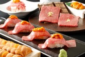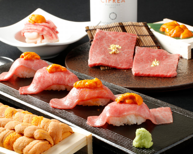 最高品質のA5ランクの和牛とウニの調和は絶品! コース注文の場合でも、「和牛握り」と「海鮮和牛ユッケ」には国産ウニが無料でついてきます。
