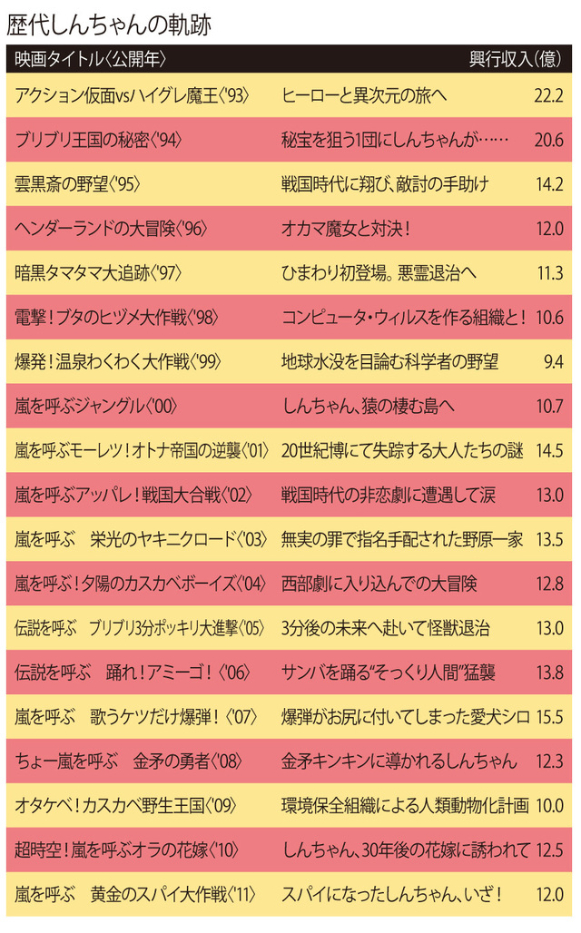 その後、映画版ならではのスケールの大きな華々しさやおマヌケさに加え、内容そのものの自由度の高さが大人の映画ファンの間でも評判となっていき、特に第9作『嵐を呼ぶモーレツ!オトナ帝国の逆襲』('01)は「大人も泣ける名作」として話題作となり、続く『嵐を呼ぶアッパレ!戦国大合戦』('02)もドラマの完成度の高さから、後に『BALLAD名もなき恋のうた』('09)として実写映画化されるなど、アニメの枠を越えた盛り上がりがなされていくとともに、両作を手がけた原恵一監督の出世作ともなった。