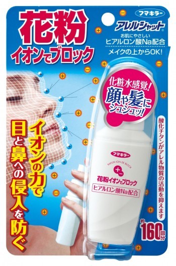 店頭などでよく見かけるアレルシャットのスプレー「花粉イオンでブロック」は、ひと吹きするとプラスイオンが顔全体を覆い、花粉が目や鼻に進入するのを防いでくれます。