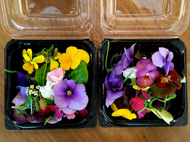 髙堂オリーブオイルではエディブルフラワーを不定期で販売している。冷蔵庫で1週間程度保管できるが、おいしく食べるためにも3日で使い切るように心がけたい。1パック648円。