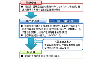 これまで下水道と接点のなかった企業にとっては、下水道分野におけるビジネスチャンスへの気づきを得られるとともに、地方公共団体や下水道関連企業とのネットワーク形成、自社技術に関心のある自治体の紹介、国土交通省が実施予定の新技術実証事業「B-DASHプロジェクト」への案内といったメリットがある。国土交通省では、農業や配送など他の分野と同じく、自動運転、ドローン活用、発電・充電、スマートフォン連携(浸水予測のアプリ配信ほか)といった、下水道の課題解決につながるさまざまなICTソリューションを想定している。