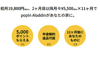 12回分の総額支払額は、8万300円(1万9800円+5500×11回)と通常購入より高いが、各種コンテンツの購入に利用できるAladdinポイント5000ポイントがもれなく付与されるので、実質は7万5300円相当となる。分割手数料・お試し料を合わせて5000円弱というイメージだ。なお、商品到着時から12カ月経過までは通常同様、メーカー保証がつく。