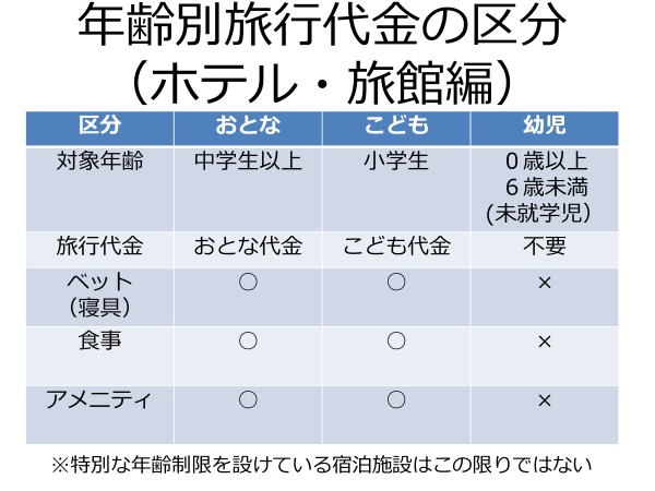 前述にも記載したとおり、一般的には未就学児のみ幼児代金となり、寝具や食事が不要の場合は無料になりますが、例外もあります。