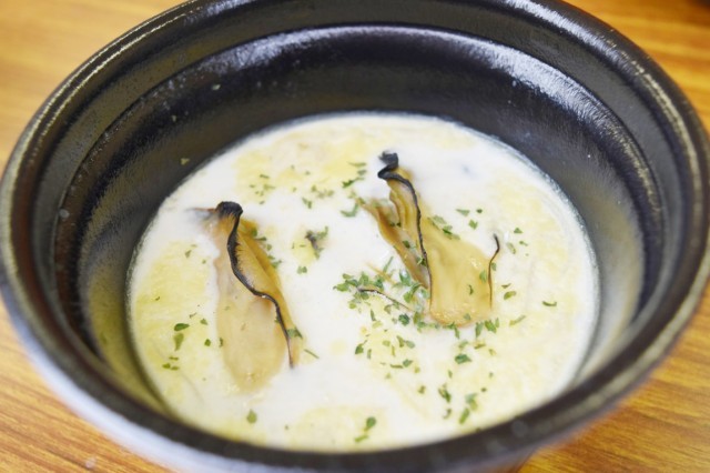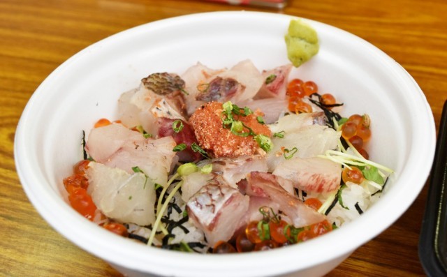 福岡で水揚げされた新鮮な魚介をぶつ切りにした豪快な丼と、「唐泊恵比寿牡蠣」の蒸し牡蠣、大粒の牡蠣が入ったクラムチャウダー。