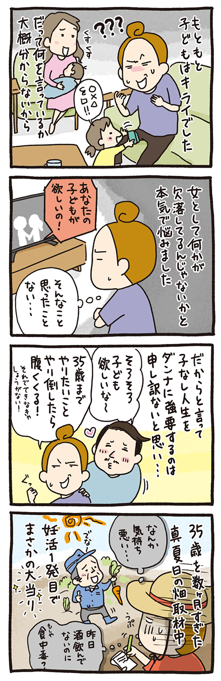 仕事が好き、酒も好き、多趣味な私には、正直“大変な育児”が足枷のようにしか感じられなかったし、「なんで私はダンナの子どもが欲しいって思えないんだろう?」と、自分が生物的に欠陥品なんじゃないか、と泣けてくることもありました。