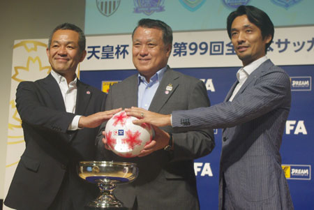 (写真左より)須原清貴天皇杯実施委員会委員長、田嶋幸三日本サッカー協会会長、戸田和幸