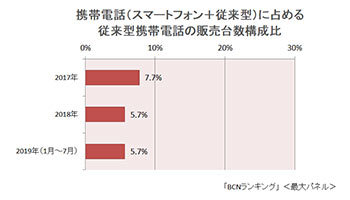 家電量販店の実売データを集計した「BCNランキング」によると、18年に売れた携帯電話全体に占める従来型ケータイの構成比は過去最低の5.7%。ケータイといっても、15年にKDDIが「ガラホ」と名付けたOSにAndroidを搭載したLTE対応ケータイとキッズケータイが上位を占めており、独自OSの従来型ケータイは既に店頭から姿を消している。