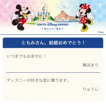 「ディズニー・オンラインギフト」購入者特典として、贈る相手へ最大50文字のデジタルメッセージカードをつけることができます。