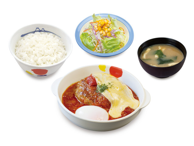 「うまトマチーズハンバーグ定食」は、ふっくらと焼き上げたハンバーグとフレッシュなトマトの酸味、ソテーオニオンの甘味、ハンバーグの肉汁、まろやか半熟玉子、そしてとろーりチーズとの相性が抜群の仕上がり。