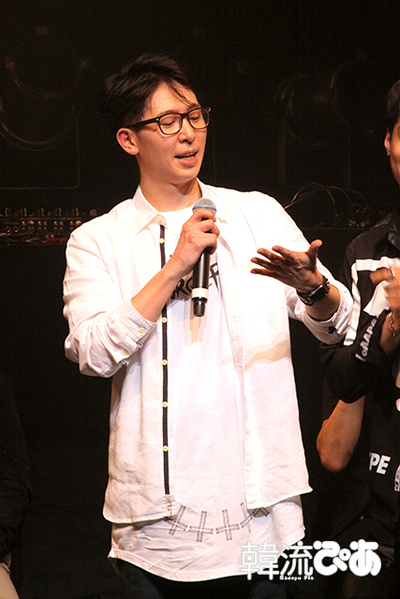シム・ジェウォンは、手に書いたカンペを見ながら日本語で「きょうはきてくれてどうもありがとうございます!」と感謝を述べ、コール&レスポンスで盛り上げた。