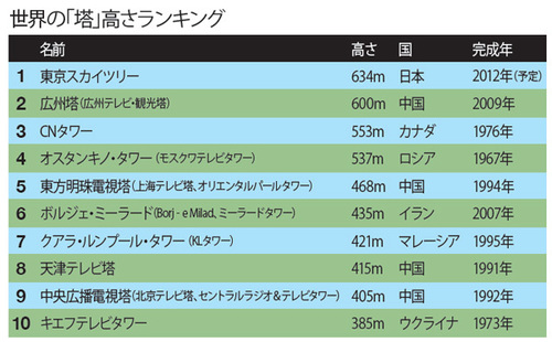 高層ビルはドバイのブルジュ・ハリファが高さ828mで世界1位だが、塔は東京スカイツリーが完成後、世界ランキング1位となる予定だ。塔の高さトップ10のうち、中国の塔が4つも占めている。建造物の高さと国の経済成長は比例するようだ。