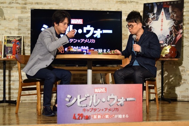 2016年3月31日(木)~4月13日(水)の期間、渋谷JINNAN CAFEにてオープンするマーベルカフェのオープニングイベントに、『シビル・ウォー/キャプテン・アメリカ』でも引き続きホークアイの日本語吹き替え版声優を務める宮迫博之さん、ファルコン役を務める溝端淳平さんが登場しました。