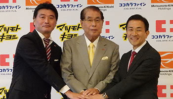 経営統合に向けて握手するマツモトキヨシHDの松本清雄社長(左)、松本南海雄会長とココカラファインの塚本厚志社長