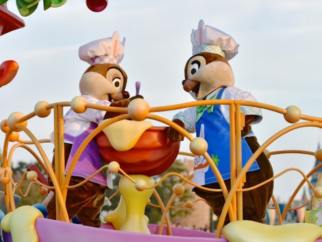 2016年度はイースターバニーの大好物を作るキッチンのフロートに、エプロン姿のチップとデールが乗っています。