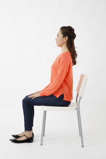 左右のお尻の中央にある骨、座骨で座るように腰かけます。自然と、背もたれに頼らず、軽く腰かけるような形になると思います。