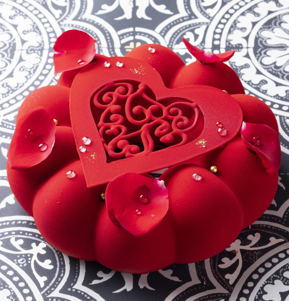 ヴァローナのビターチョコレートのムースでブラックベリー&ブルーベリーのジュレを包み込み、繊細なチョコレートでラビリンスを表現した『ハッターが待つラビリンス・ノワール』や、まるで王冠を乗せるピローのようなフォルムとレースを思わせるチョコレートがエレガントな『アリスのハート・ラビリス』など、気品漂うスイーツがラインナップ。
