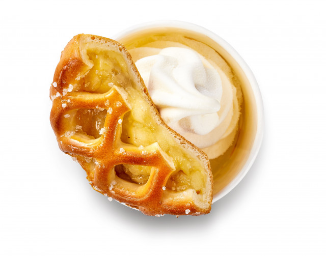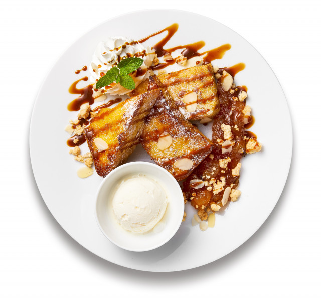 フレンチトーストアップルパイ風には、温かいフレンチトーストに、シナモンの風味が豊かな果肉たっぷりのりんごジャムとホイップクリーム、キャラメルソースを添えていただきます。