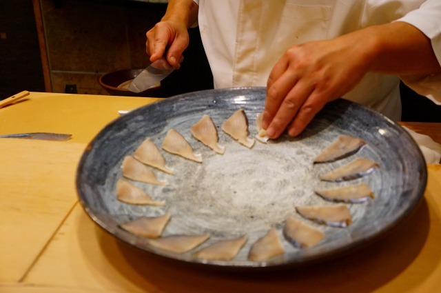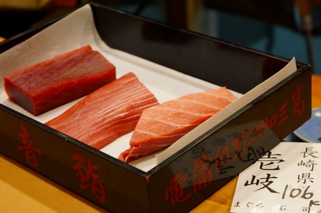 赤身、中とろ、大トロと切り分けられて、黒塗りの箱で室温に戻され後ほど生で握られ、もうひと組は漬け用に。