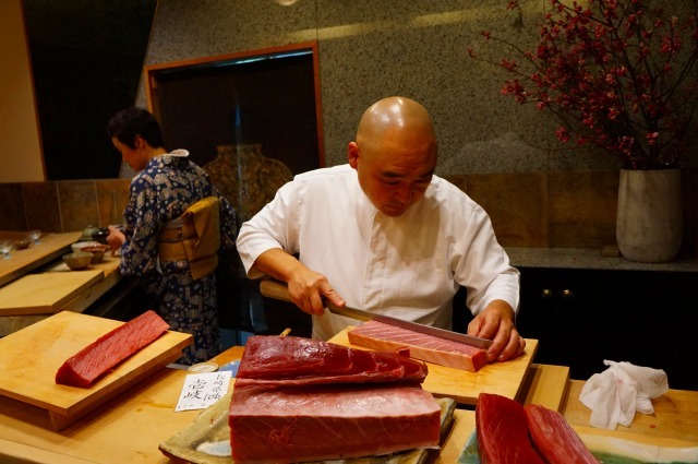 蒲田初音鮨 特製包丁で鮪をさばく大将
