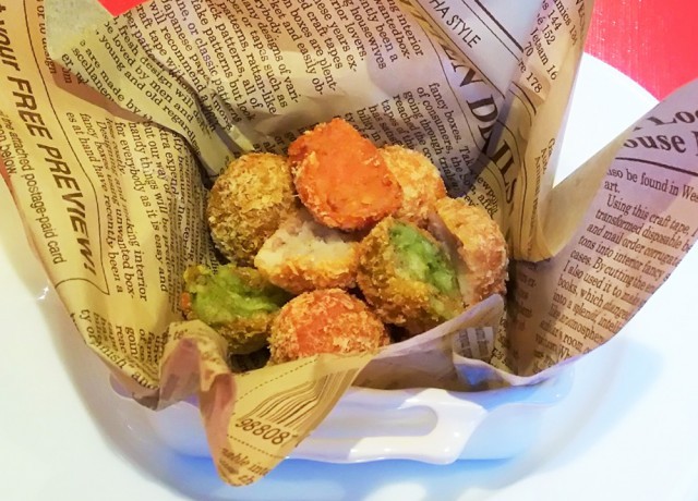 プレーン、トマト、バジルの三種が一度で味わえるプチコロッケ。